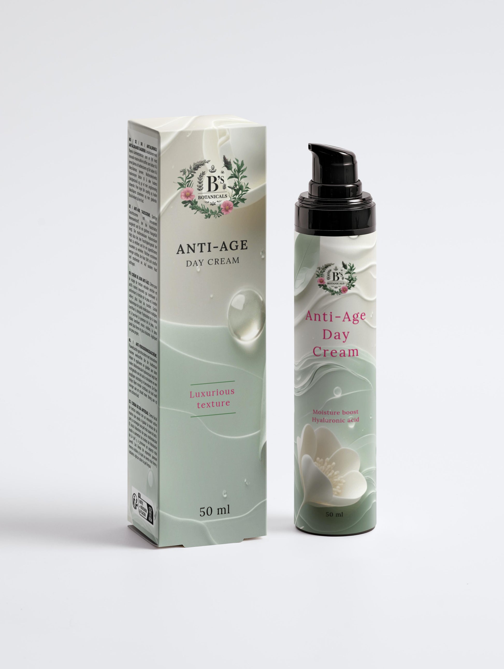 Experience the luxurious care of B’s Botanicals Anti-Age Day Cream — a velvety, deeply hydrating moisturizer designed to enhance your skin’s natural vitality and radiance.